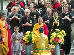 The visitors, including some twenty females, took part in a ritual on Wednesday to pay their respects to the Shaolin Temple in Dengfeng, Henan Province.