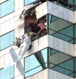 Images of the plane blasting a hole in the side of a skyscraper were chilling reminders of the World Trade Center attacks. Until it was pulled in early Sunday, the plane's tail had dangled from the 28th floor of the building.