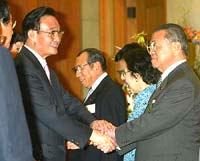 The reception was jointly held by Japanese House of Councilors President Hiroyuki Kurata and House of Representatives Speaker Tamisuke Watanuki in honor of Wu Bangguo, chairman of the Chinese National People's Congress (NPC) Standing Committee, who is here on a week-long official goodwill visit.