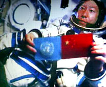 The astronaut also showed a United Nations flag to highlight China's persistent stand for peaceful exploration and exploitation of space, according to sources with the Beijing Aerospace Command and Control Center.