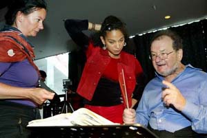 Michel Sasson (right), conductor of the opera Carmen, discusses performance details with leading actress Sarah M'Punga (middle) and director Rian van Holland at a rehearsal yesterday in Shanghai.