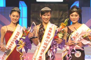 Xu Qian (C), winner of the Miss Tourism Queen International 2004 China finals, poses with the first runner-up Tian Lili (L) and the second runner-up Yin le (R) in Guiyang, October 18, 2004.