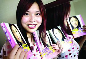 The man-made beauty Yang Yuan smiles at cameras holding her new-published book.