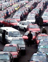 Rows of taxis queue in front of the Beijing Railway Station to wait for customers. The industry's monopoly situation and harsh competition have worsened the working conditions of taxi drivers.