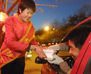 A taxi driver receives a packaged dinner from a hostess at a Beijing restaurant. Many drivers have to sacrifice their dinner time in order to fulfill their daily quota and make ends meet.