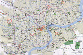 From December 21 to 31, 2004, there were 2,456 thefts reported in Shanghai, according to the Jiefang Daily. Most of them occurred in locations noted on the map.