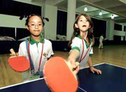 The picture shows that nine-year-old Vali Rothstein from the United States partners with Yang Qinge, 10, during a table tennis match at the Interactival 2002 summer camp.