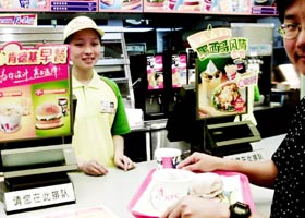 The recently taken photo shows that a customer buys a set of Chinese-Western combined breakfast in a chain restaurant of KFC on the Huaihai Road in Shanghai. KFC began to provide Chinese gruel as part of breakfast in nearly 80 branches in Shanghai from the 5th of August 2002. (Xinhua Photo/Zhang Ming)