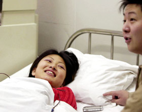 Meng Xiaoye, the first stem cell donor from Beijing, lies on a bed for blood collection accompanied by her boy friend at a hospital in Beijing, China, Nov. 19, 2003.