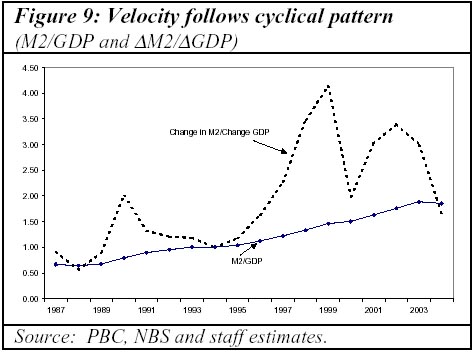 The PBC's monetary program for 2005 includes targets for (yoy) M1 and M2 growth of 15 percent, and RMB 2.5 trillion of new Renminbi loans. Compared to the outcome in end-2004, this implies roughly unchanged growth of monetary aggregates. Such growth rates of monetary aggregates are broadly in line with growth and inflation targets, provided no major changes in velocity, or its inverse, M2/GDP. China's ratio of M2 to nominal GDP has been trending upward from 0.37 in 1980 to 1.85 in 2004 as a result of gradual financial deepening and monetization. The marginal ratio (the ratio of the change in M2 to the change in nominal GDP) has shown a highly pro-cyclical pattern, falling during a boom, and rising after a boom. On the basis of the World Bank projection of 8.3 percent real GDP growth, a 15 percent growth in M2 would yield an inflation in the GDP deflator of some 3-5 percent, if M2 over GDP gradually returns to trend levels. The announced switch from a "proactive"to a "prudent"policy stance should probably be seen as reflecting an increased willingness to increase interest rates to achieve such an inflation target consistent with a "soft" landing.