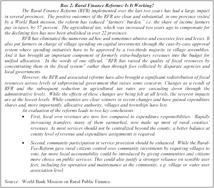The emphasis on rural public finances is appropriate, as this is where services fall most short of the standards suited for a Xiaokang society. Already, rural finances are going through considerable reforms, and the number of provinces that have abolished agricultural taxes has increased to 22 (Box 2).