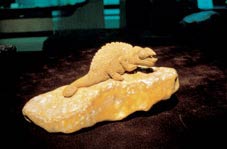Wang's qiaose (pretty color) works have won people's admiration. Wang designs his work according to the color and vein of stone materials he has selected. He ingeniously exploits the characteristics of the selected stone and sculpts with great care and consummate skill. His works of small animals, including frog, turtle, snake, and scorpion, in natural colors and various postures, look lifelike, which is inconceivable to many people. The colorful stones Wang has used include balin from the Inner Mongolian Autonomous Region, jixue from Zhejiang Province, lingbi from Anhui Province, and caitao from the Guangxi Zhuang Autonomous Region.