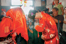 Following that, the couple made ceremonial obeisance: first they bowed to the groom's parents, then to each other. After that, they drank from the nuptial cup, an indispensable part of an old-fashioned marriage ceremony. Not familiar with the procedure, the foreign bride was a little bit awkward and made small mistakes from time to time. Every time this occurred, though, the considerate groom would lean closer to her, whispering something in English to put her at ease. Parents-in-law, relatives and friends all wore smiles, and showed consideration and tolerance.