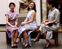 Three Chinese women present traditional Chinese qi pao, a close-fitting woman's dress with high neck and slit skirt, at the opening of the "Chinese Qi Pao in 100 Years" show in London December 2, 2001.