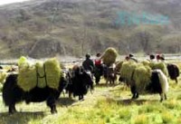 Heads of yaks carry couch grass for the upcoming winter in Nagqu County, northern Tibet Plateau of Tibet Autonomous Region December 20, 2001.