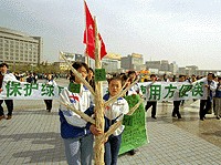 Students from Shandong Environmental Protection School carry a tree made of disposable chopsticks along the major streets and squares in Jinan, capital of East China’s Shandong Province, on Sunday.