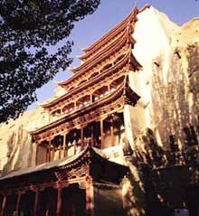 The Mogao Grottoes, twenty-five kilometers southeast of Dunhuang City, contain the largest and richest treasure trove of stone carvings and mural paintings in China. Carved out along a 1,500-meter precipice, the 492 grottoes stretch from south to north on the eastern slope of Rattling Sand Mountain (Mingshashan) and are divided into five levels. They contain 45,000 square meters of murals 2,415 painted statues, and five wooden structures. The statues were all made of clay and colored with paint. Themes of the murals range fro Buddha portraits and Buddhist stories to fairy tales and pictures of worshippers.