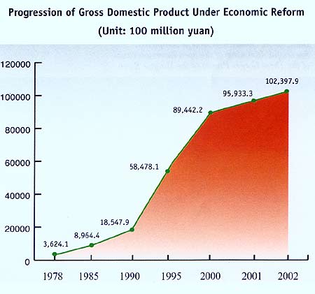 In 2002 the Chinese economy continued its impressive growth rate with the gross domestic product (GDP) topping 10 trillion yuan, an increase of 8 percent over 2001 at comparable prices with the year 2001. This figure helps show the progress made in China since the end of the 1970s when China's leaders—mindful of the gap in economic growth between China and other countries—made the momentous decision to reform China's decades-old economic system. In the first 30 years after the founding of the PRC in 1949, the Chinese government carried out a system of planned economy, and targets and quotas for various spheres of economic development were all set by the "planning committees" of the state. Factories produced goods according to state plans, and farmers planted crops also according to state plans. Commercial departments replenished and sold their stocks according to state plans, and the qualities, quantities and prices of the goods were all fixed by planning departments. On the one hand, this system contributed to the stable, planned development of China's economy, but on the other hand it also limited the development of the economy and sapped its vitality.