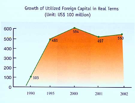 In 2002, foreign capital utilized by China in real terms came to US$ 55 billion, including US$ 52.7 billion direct foreign investments, ranking the country first in absorbing foreign capital in the world for the first time. The State Development and Reform Commission holds that under the situation in which the world economy is depressed — with international investment decreasing considerably — China has achieved this prominent success in absorbing foreign capital through having kept its word when entering the WTO to reduce the overall level of the customs duty, lift the restrictions over the fields for foreign investment and financing, open wider to the outside world, and revise and perfect foreign-related laws and regulations.