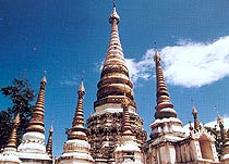 Dajin Dagobas are located inside Zhele Dajin Temple at Zhele Village about eight kilometres east of the county town of Ruili. Legend has it that buried under these dagobas are bones of the first seven incarnations of Sakyamuni. Built very early, the dagobas underwent repairs in the fourteenth century when the temple was expanded. Repairs were also done to the present dagobas more than a hundred years ago. Repeated repairs over the last half century make them look even more magnificent than ever.