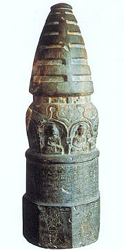 The other stone pagoda, called Chengduan'er Pagoda, was unearthed with the Sakyamuni Buddhist Pagoda. The structure and shape of the two pagodas and their carvings are similar. Obviously, they were sculptured at the same time. Chengduan'er Pagoda is 42.8 centimeters high and the diameter of its base is 12 centimeters. The two pagoda differ in five ways: 1. Chengduan'er Pagoda is slenderer. 2. Its niches for Buddhist images on the inverted bowl have lintels carved with designs of beads. 3. Designs of lotus petals are carved under the main body of the pagoda. 4. No vertical lines run through the seven tiers of the steeple's main body. 5. The pagoda doesn't have the Eight Diagrams and a star map.