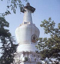 The White Dagoba at Lianxing Temple, like the white dagobas at Miaoying Temple and Beihai Park in Beijing, is an inverted-bowl-shaped building, but it is light and slim, having absorbed the architectural style of south China. The base of the dagoba is a rectangular platform surrounded by balustrades. Winding staircases lead to the top of the platform. The dagoba's pedestal, built right in the middle of the platform, is decorated on all sides with exquisite patterns on carved bricks. The inverted-bowl- shaped body, more like a bottle, was the result of further development of early dagobas of its kind, which featured a dome-shaped body. The steeple on the main body of the dagoba is composed of a small Sumeru pedestal, a thirteen-tier cone and a metal canopy. On the very top of the steeple is a glittering gilded copper gourd and bead. Tall and big, it is the grandest such dagoba in the south of the country.