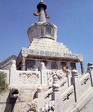 The White Marble Dagoba, at the southeastern corner of the temple, was constructed during the reign of Emperor Kangxi of the Qing Dynasty. The fifteen-meter- high structure was made entirely of white marble. The main body of the dagoba is in the form of an inverted bowl. The stone pedestal underneath is embellished with exquisite carvings. Meriting especial attention are four stone columns with carved dragons twining around them supporting the four corners of the pedestal, rarely seen in Lamaist buildings. Between the inverted-bowl main body and the pedestal are four terraces. On top of the dagoba is a thirteen-tier steeple crowned by a canopy, a crescent and a precious bead. The whole body of the dagoba is covered with ornamental carvings and patterns painted in bright colors. It is one of the largest and most beautiful dagobas of its kind in the country.