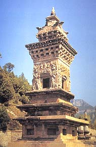 A single-storey pavilion-style structure, the pagoda has a square base and doors on all four sides. Its three-level Sumeru pedestal is huge, and the carvings on it--images of the Buddha, bodhisattvas, celestial guards and flying apsarases as well as dragons and tigers in high relief--are gorgeous and vivid. On each side of the square central pillar inside the pagoda are carved images of Buddha in the style of the Tang Dynasty.