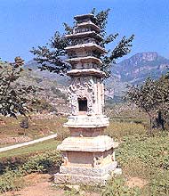 Its special structure can be said to be a combination of the pavilion and multi-eave styles. The pagoda is entirely sculptured out of stone. Its lower part is made up of two Sumeru pedestals; on top is a square chamber with a door in front. Carved in relief on both sides of the door are heavenly kings and above the door are dragons and tigers. The corner pillars of the chamber are carved with dragons. All the carvings are in high relief and appear vigorous and forceful. Above the chamber rise six levels of pent roofs (there used to be seven). The entire pagoda is more than three meters high.