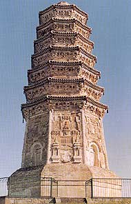 The pagoda stands atop a hill (Shipen Hill) five kilometers south of the site of the upper capital of the Liao Dynasty. The octagonal, seven-storeyed, multi-eaved brick pagoda is about 25 meters high. Carved on the pagoda walls above the first storey are dozens of reddish brown stone statues of Buddba, bodhisattvas, heavenly kings and celestial guardians. These vivid and finely carved images are valuable art works in the Liao Dynasty style. The seven levels of eaves above the first storey of the pagoda are supported by carved brick brackets and rafters under them. This pagoda distinguishes itself from all pagodas of the Liao Dynasty in its structure and workmanship.