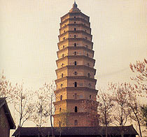 The octagonal brick pagoda, 79.19 meters high, has thirteen storeys, supported by a plain stone pedestal of 1.8 meters high. The main body is built of greenish bricks. Above a door on the southern side of the first storey is a name plate inscribed with the Chinese characters for Chongwen Pagoda. The other storeys all have arched doors on four sides and niches for Buddhist statues on the other sides, alternating sides to avoid the risk of cracks. The vivid, exquisite stone standing or seated statues of Buddha in the niches all have different postures. Inside the second storey is a metal standing Buddha. The eaves of the pagoda are built of brick and carved with various ornamental designs. On the corners of the pagoda's exterior are round brick pillars. The whole pagoda rises sturdily into the sky, in height second only to the 84-metre-high Liaodi Pagoda in Dingzhou. Thus it is the second highest pagoda in China.