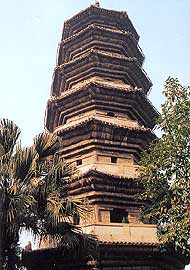 The Black Pagoda was built of dark gray granite. The octagonal, seven-storeyed structure is thirty-five meters high. All the pent roofs are built of three tiers of slabstone covered by stone roofing. The roofs are wide and graceful and look very much like umbrellas, making the pagoda an outstanding example of brick and stone pagodas with pent roofs. There is one door on the first storey of the pagoda, but two on the remaining storeys. The sides without doors have niches for stone Buddhist statues. In every corner of every floor there is a pillar; carved on the pillars of the ground floor are images of heavenly kings and celestial guards, which look vivid and lively and are the originals. From the door on the ground floor visitors can ascend a staircase inside the pagoda for a view of Fuzhou.