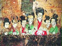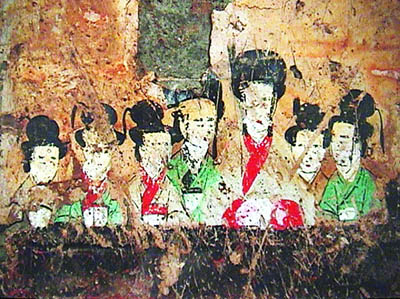 The painting on the southern wall of the chamber portrays the hostess and her female guests. Kneeling upon wooden mattresses, the women enjoy a dance show. Round stands are placed in front of the women and lacquer cups are laid on the stands.