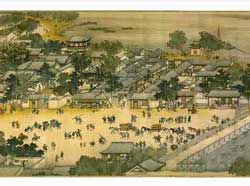 Variously translated as "Going Upriver for the Qingming Festival" or "Peace Reigns on the River," the 528.7-centimetre-long silk handscroll in ink and colors depicts a panorama of daily life, business and social interaction in Bianliang, the capital of the Northern Song Dynasty and today's Kaifeng in Henan Province.