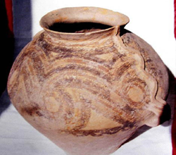 The 45-centimeter-tall pot, made of mud interlarded with sand, is being kept in the Majiayao Culture Research Institute of Lanzhou, the capital of Gansu. It has a small base, widening to as much as 48 centimeters at its waist and then narrowing again to form a wide mouth. The body is decorated with black, yellow and red spiral patterns.