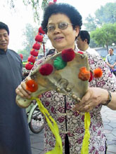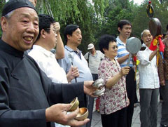 On June 1, senior actors of Beijing's Overpass Folk Custom Art Troupe staged a street performance which was popular in ancient Beijing at the Hehua (lotus)Market.