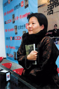 Hung Huang, holding in Shanghai newly published autobiography, attends the promotion in Beijing.