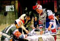 Minority women in Huangping, Danzhai, and some other minority place in Guizhou are very skilled in making batiks. As an indispensable part of their apparel, young girls learn to make batik, to weave, and to embroider at a very early age.