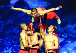 Various weapon routines then ensue. In Shaolin kung fu, 18 different types of weapons are employed, including broadswords, spears, maces and knives. For the purposes of show, the swords are made of heavyweight foil that crackle and snap clearly across the loud music.