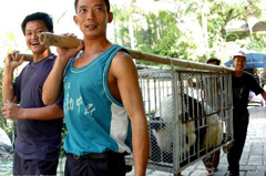 Workers carry giant panda "Ba Qi" in Fuzhou, capital of southeast China's Fujian Province, July 12, 2004. "Ba Qi" and another giant panda "Xiao Qing" were transferred on July 12 from a zoo in Fuzhou to a giant panda summer resort on the Guling Hill, 1,000 meters above the sea level, near the city to avoid summer heat.