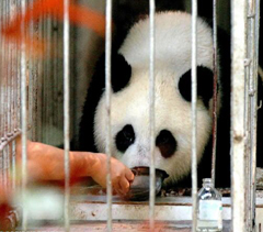 A zoo keeper feeds giant panda "Xiao Qing" in a zoo in Fuzhou, capital of southeast China's Fujian Province, July 12, 2004.