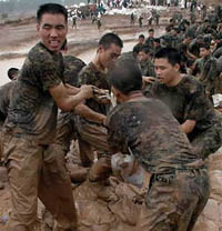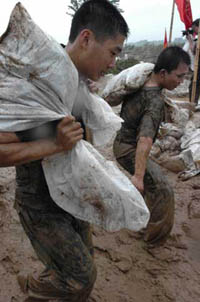 Chinese soldiers line up to reinforce a dam on Lihe River in Wuyang Country, central China's Henan Province, using sand bags, July 20, 2004. Continuous rainfall hit the area this week, putting dams along the Lihe River in risks. More than 2,000 soldiers have been sent there to reinforce the dams.