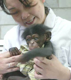 A zookeeper holds a chimpanzee cub in Beijing July 23, 2004.