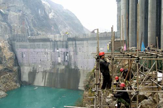 Workers put up a scaffold at a hydropower station construction site along the Wujiang River in southwestern Guizhou Province. The station, set to start in August, is one of the first eight in Guizhou to supply power to the country's eastern parts, which suffer energy shortages.