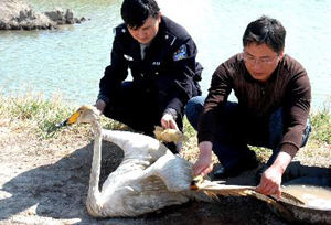 Two local policemen clean wings for a swan in Turpan Prefecture of northwest China's Xinjiang Uygur Autonomous Region on April 12, 2005. The white swan fell to a farmland due to illness during its migration on April 5. Local police came to its rescue after farmers spotted it and informed the police.