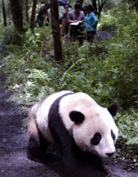 Two-year-old panda Xiangxiang is set free in the natural breeding district in the China Giant Panda Breeding and Research Center in Wolong in the southwest China's Sichuan Province on July 8, 2003. Xiangxiang is the world's first giant panda to be returned to nature after being raised by humans.