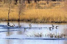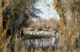 Egrets are flying over a watercourse in the lower reaches of the Tarim River.