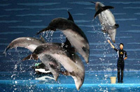 Dolphins give a performance for delighted visitors at the Marine Animal Exhibition Hall at Tiger Beach, Dalian in northeast China's Liaoning Province.