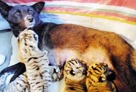 Four tiger cubs are suckled by their "dog mother" because their own mother doesn't have enough milk to feed all six of cubs she give birth to last month in Hangzhou, Zhejiang Province. The youngest cub, however, was too weak to survive and died Sunday midnight.