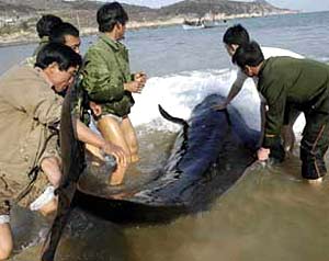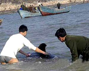 Seven whales swim and are washed ashore on March 8 near an island in Pingyang County in east China's Zhejiang Province. Fishermen and local residents came to their rescue and helped the whales back into the deep ocean. The photo shows local residents try to drive the whales away from the shadow waters.